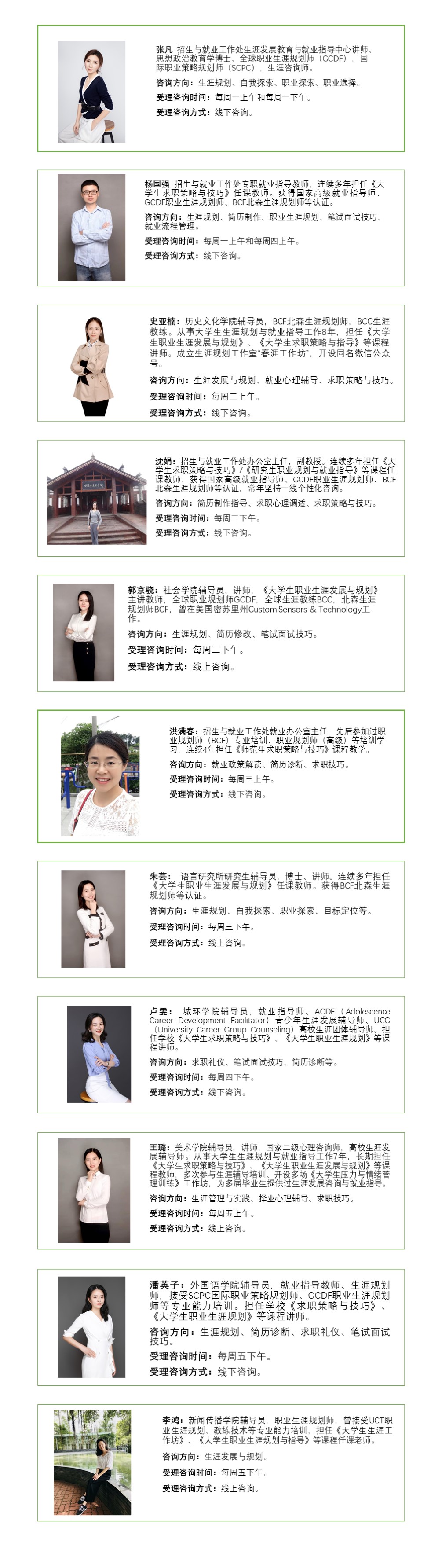 个性化咨询服务。咨询的内容主要包括自我探索、目标定位、生涯管理、职业探索、职业选择、简历诊断、求职技巧,职前适应等方面。