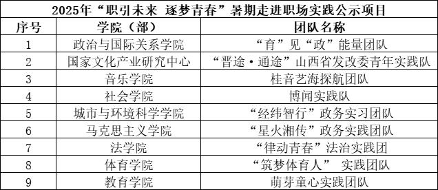 集中评审,2025年“职引未来 逐梦青春”暑期走进职场实践活动获批立项9个,现予以公示,排名不分先后,公示期为6月23日至6月25日。