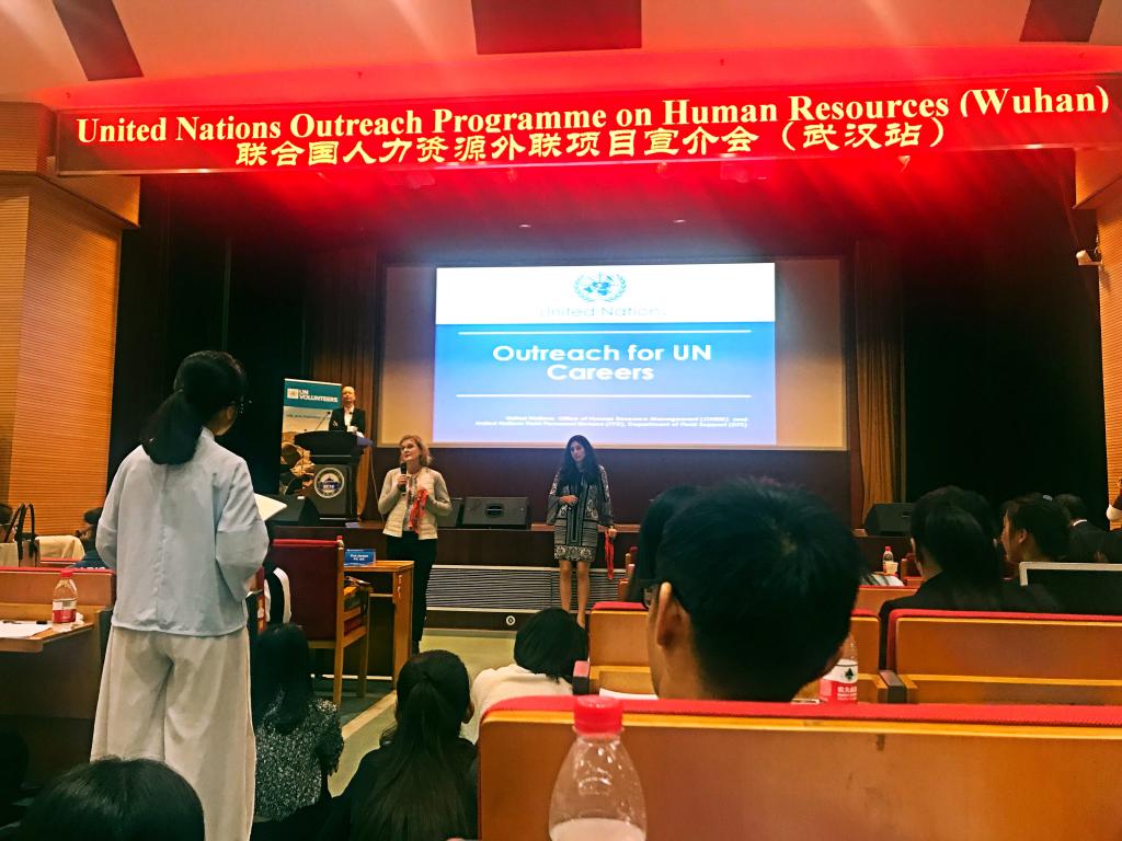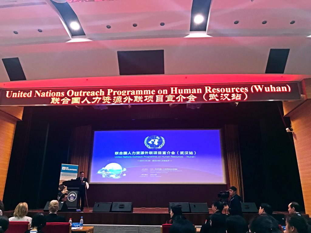 2017年10月28日上午9点,联合国人力资源外联项目(UN Outreach Programme on Human Resources)武汉地区宣介活动在武汉大学人文科技馆举行。此次活动由中国人力资源和社会保障部主办,武汉大学承办,是联合国人力资源管理厅来华开展人力资源外联项目宣介活动的重要一站。联合国人力资源外联项目代表团,武汉大学党委副书记赵雪梅等出席活动,部分国际组织专家学者以及来自武汉大学、华中科技大学、轻小说
