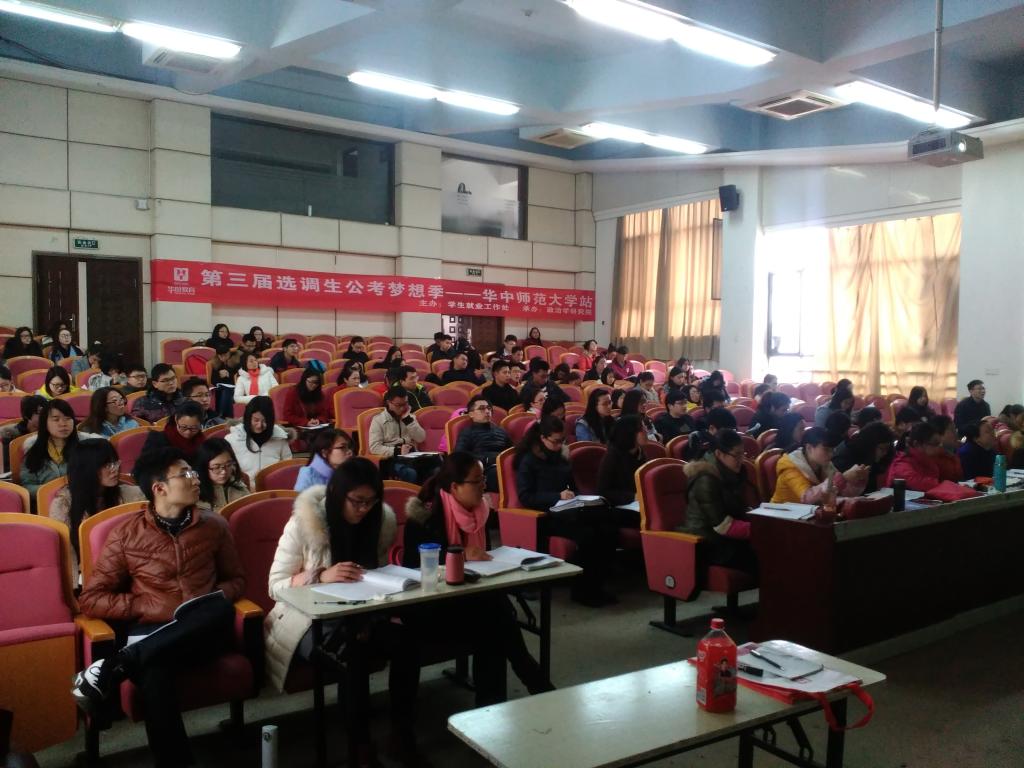 (通讯员包安)为进一步提升我校毕业生选调生考试技能水平,2月23日至26日,2016年“公考梦想季”湖北省选调生考试公益培训华师班在我校9号楼1楼报告厅成功举办。本次培训由校学生轻小说