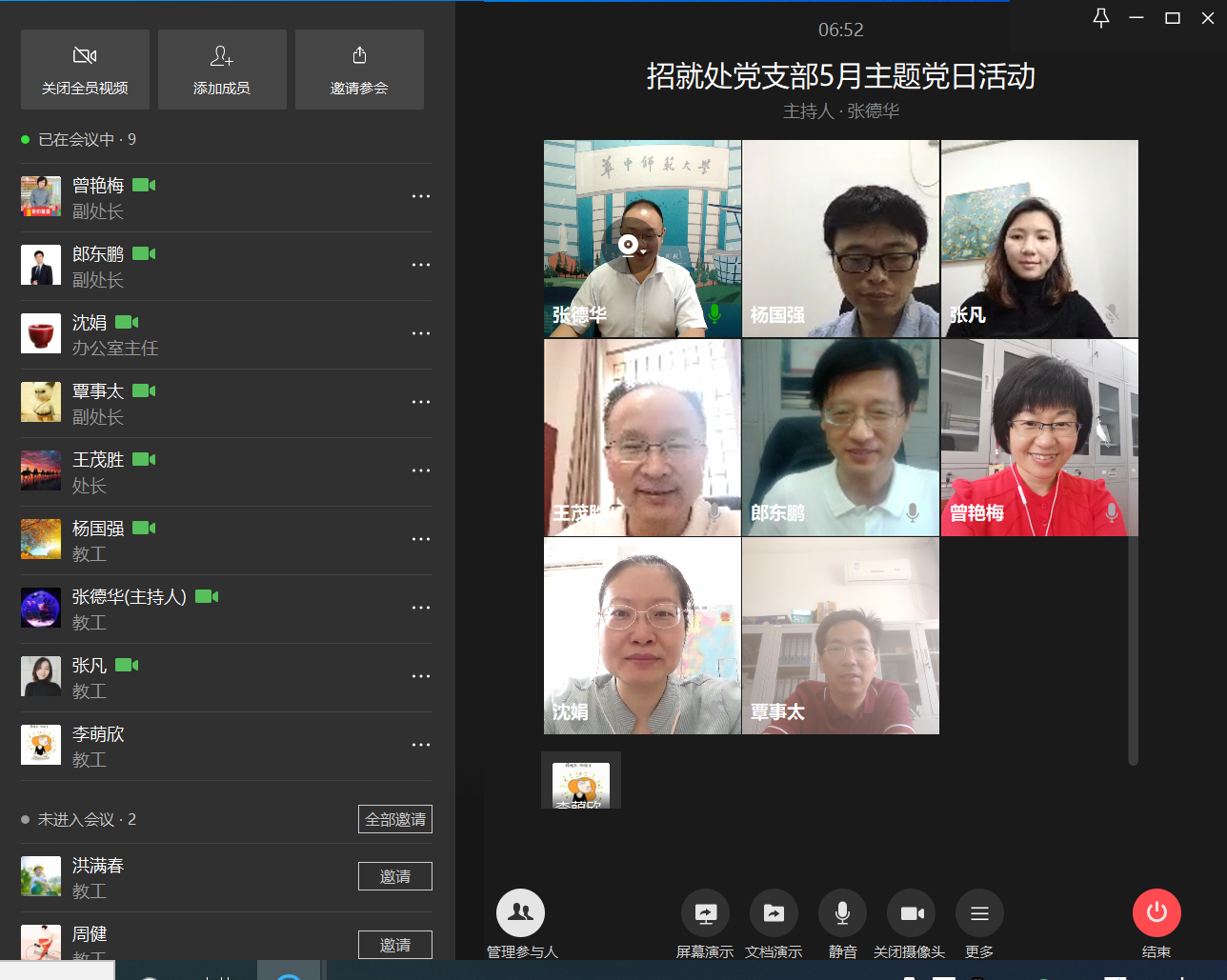 党支部5月份主题党日活动在线开展。按照学校机关党委的要求,在线通过支付宝或者微信缴纳5月份党费,重温入党誓词,学习党章章节后。支部组织委员张德华分享了学习两会相关材料的心得和体会,王茂胜带领大家开展了理论学习。本次支部活动由支部书记王茂胜主持,全体党员参加了活动。