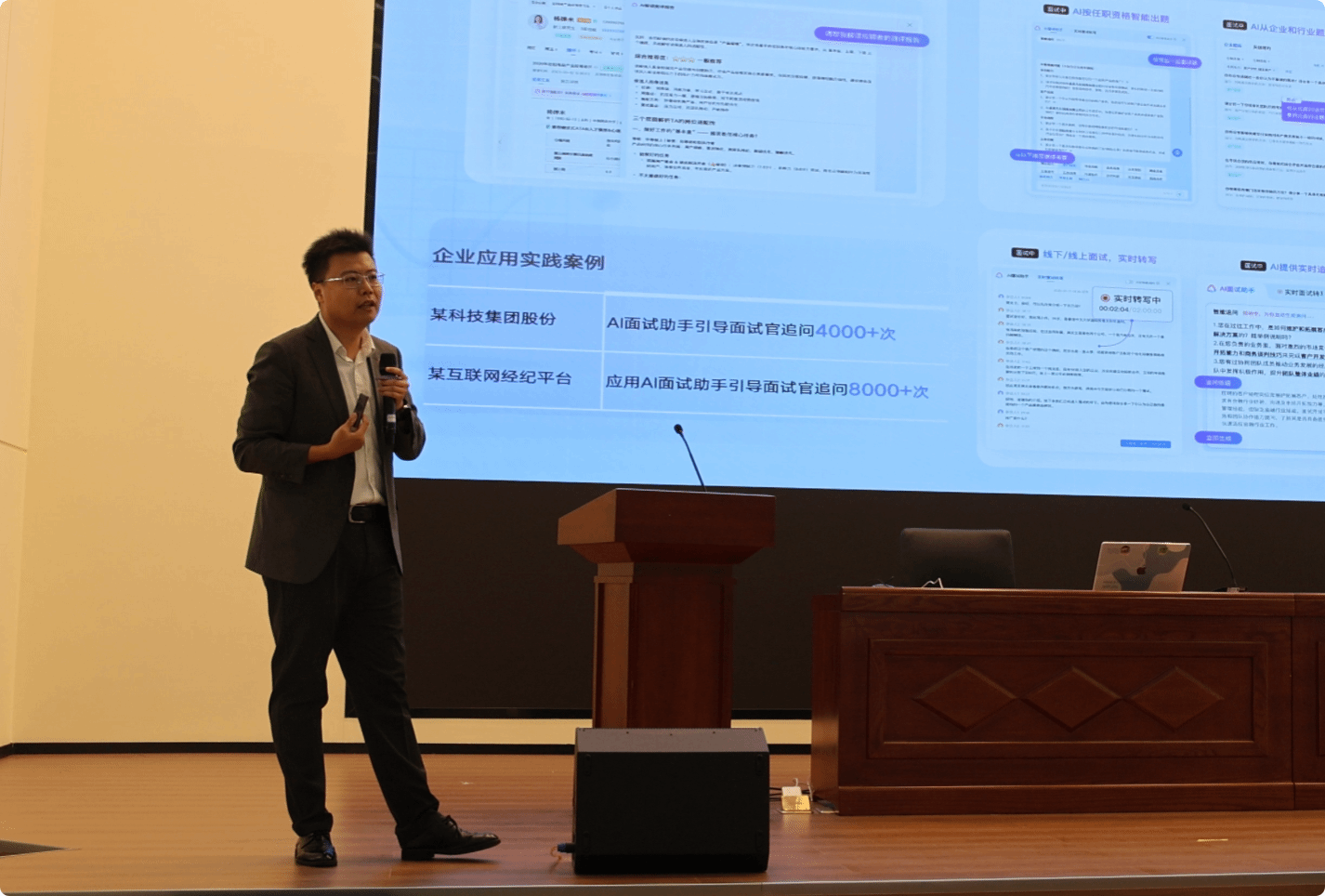 会前,国内知名人力资源管理解决方案供应商北森公司高级经理刘文韬为与会老师做了题为企业视角下人力资源招聘中AI实践应用的报告。刘文韬从AI发展趋势、企业人力资源招聘中的AI应用、企业AI招聘底层逻辑拆解等方面分析了当前企业应用AI开展招聘的技术原理,针对高校教师如何对毕业生进行AI面试辅导进行了重点培训。