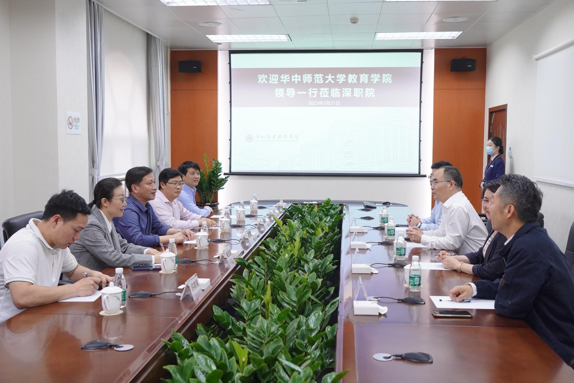 3月21日下午,调研组一行受到深圳职业技术学院的热烈欢迎。座谈会上,深职院校长许建领教授、传播工程学院杨燕云书记、科研处处长阮艺华、保卫处处长曾亚纯分享了各自在武汉的学习经历及与华师的缘分。许建领校长介绍了深职院发展现状,他表示“非常希望华师毕业生到深圳到深职院工作学习,发光发热。”座谈会结束后,调研组一行受邀参观了深职院传播工程学院、数字创意与动画学院、崇理书院。